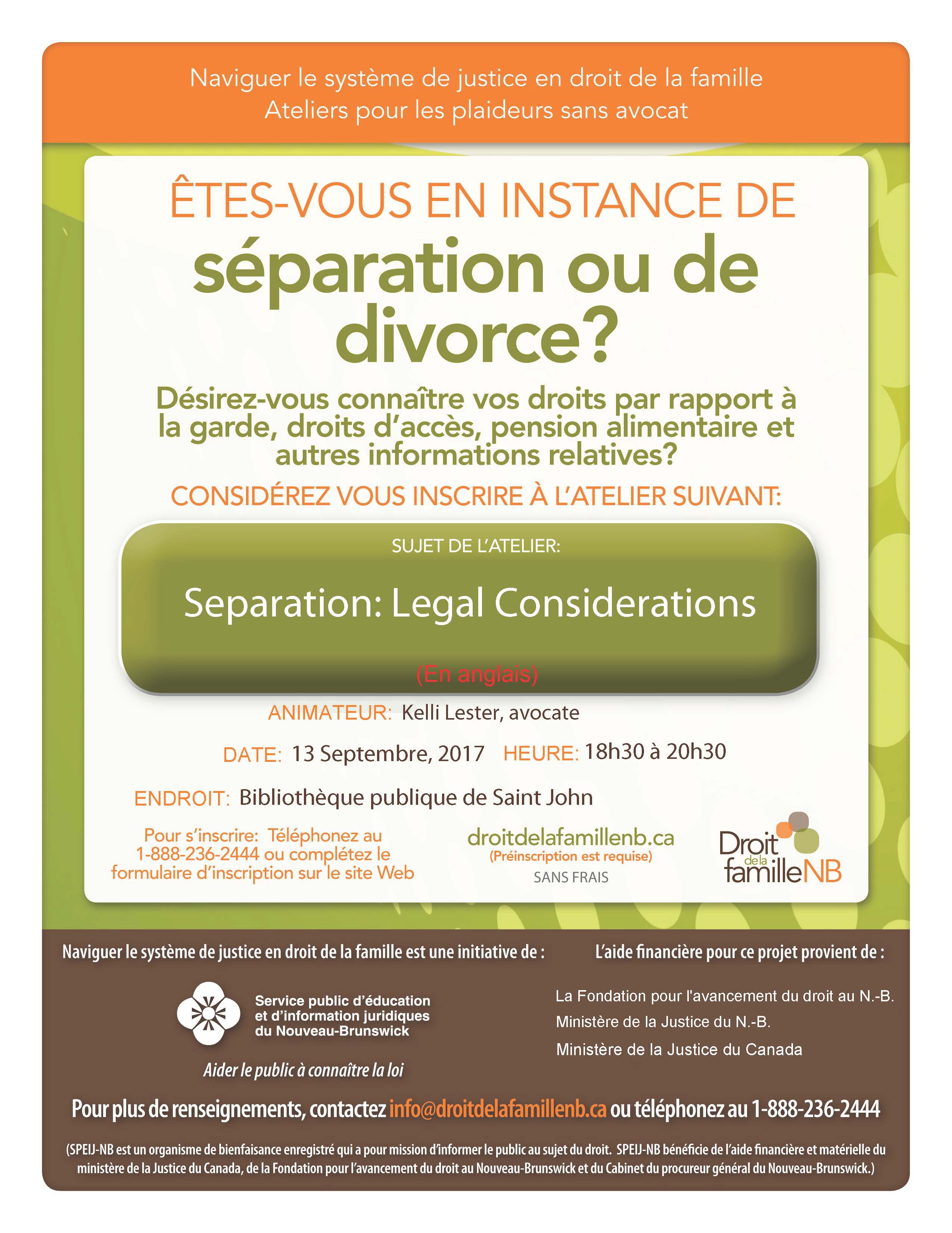 Fredericton 14 septembre - Doing Your Own Divorce Moncton 14 septembre - Family Law & Immigrants Saint John 14 septembre - Separation: Legal Considerations